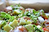 Ingredientai 500 g. raugintų kopūstų 1 morka 1 obuolys Padažui 0,5 st. grietinės 10 graikinių riešutų 0,5 citrinos sulčių truputis druskos truputis cukraus truputis riešutų, citrinos, petražolių papuošimui