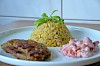 Marinuoti vištienos kepsneliai su virtais - keptais ryžiais bei daržovėmis